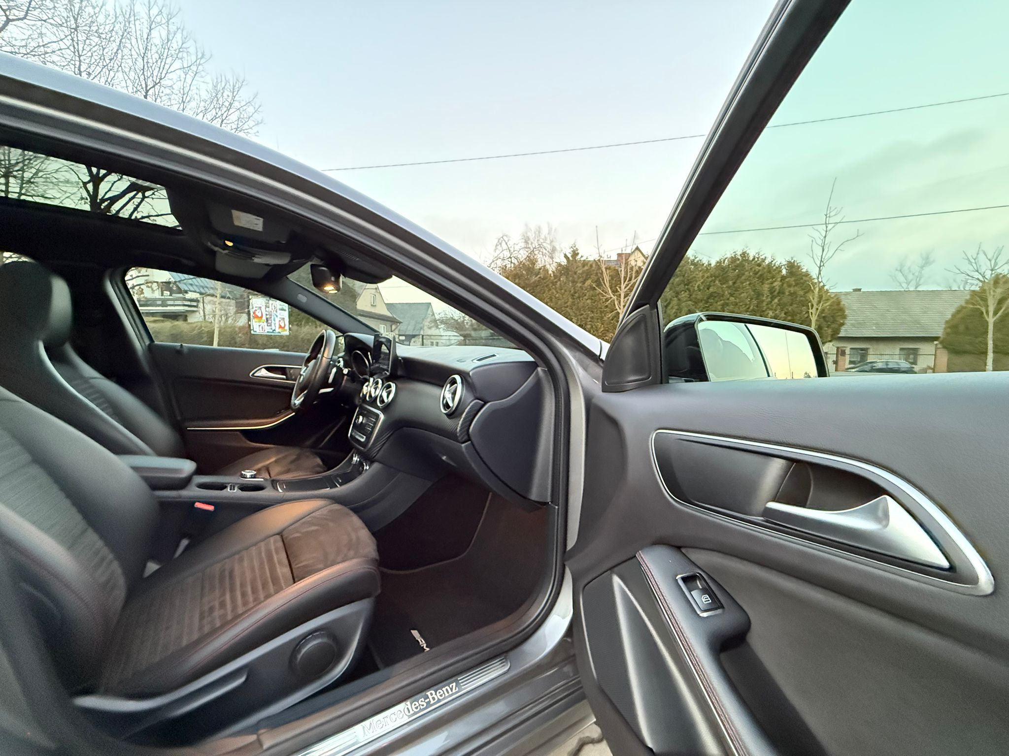 Wersja wyposażenia obejmuje m.in. pełny pakiet AMG, reflektory full-LED, tempomat, dostęp bezkluczykowy, dach panoramiczny, system multimedialny z nawigacją GPS, kamerę cofania, czujniki parkowania przód i tył, asystenta parkowania, tapicerkę skóra + alcantara, alufelgi 18", oświetlenie ambientowe, podświetlane progi, przyciemniane szyby, czujnik deszczu i zmierzchu, klimatyzacje automatyczną 2-strefową, przyciemniane szyby, lakier metalizowany, komplet poduszek powietrznych oraz ISOFIX.